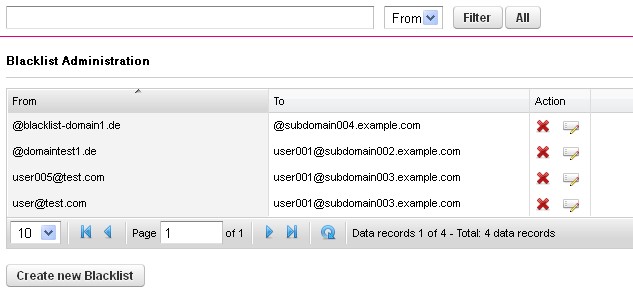 This is where individual email addresses or entire domains can be added to / deleted from the blacklist (addresses from which the user does not want to receive emails). Messages from a sender on the blacklist are always marked as junk/spam mails. Entries in the whitelist take precedence over entries in the blacklist. Domain-wide entries are not affected by these settings.